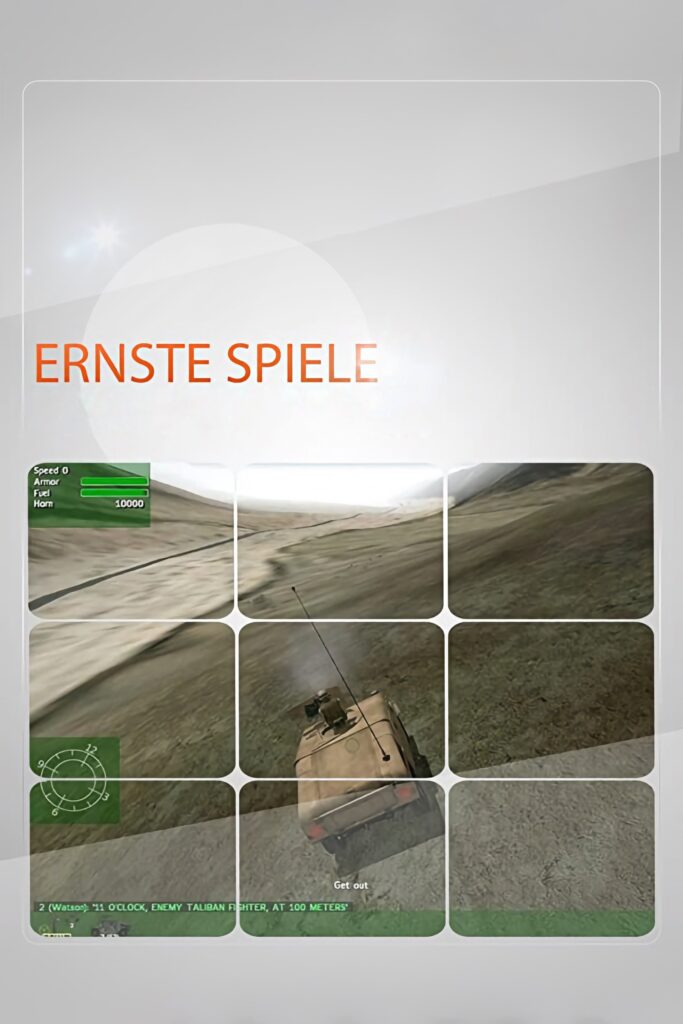 Harun Farocki: Serious Games I–IV (2009–10) explores the use of virtual reality and gaming technology in U.S. military recruitment, training and after-action therapy, revealing fundamental links between technology and violence in a time of war. Young recruits engage in simulated combat training, which barely differs from video games produced as entertainment. Footage is included from a workshop demonstrating the use of computer re-enactments in the psychological care of veterans suffering from post-traumatic stress disorder. As a large-scale installation, Serious Games critically focuses on the role of audiovisual culture in the spectacle of war.